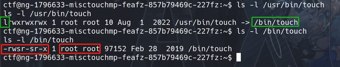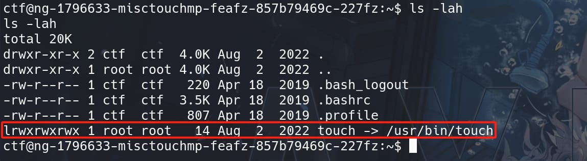 The name of this challenge is Touch, then we can discover a link inside the Home directory, pointing to /bin/touch: