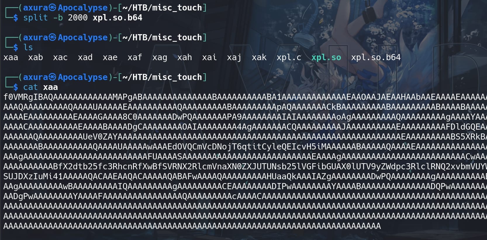 split -b 2000 xpl.so.b64This command splits the base64 encoded file into chunks of 2000 bytes each. Adjust the size as needed based on what our poor shell can handle: