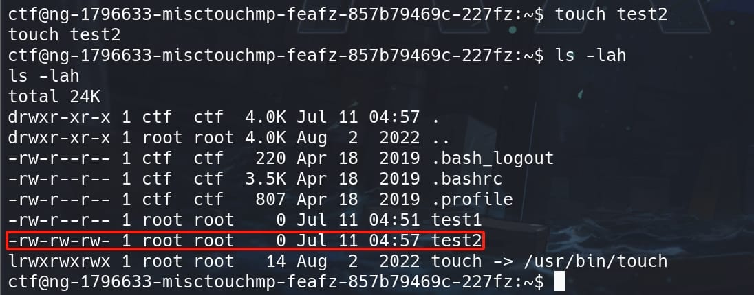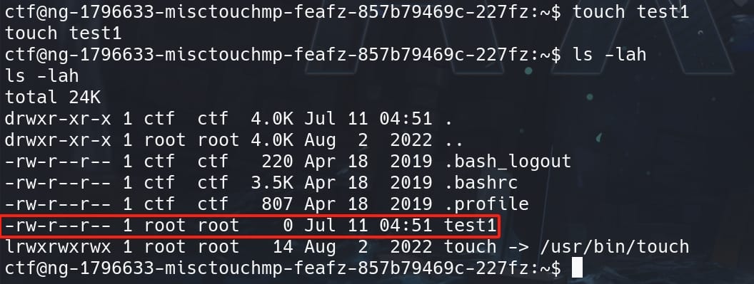 Well, since the permissions on touch is abnormal in this case, we can test a little bit on how it proceeds to create files. Create a test file using touch test1 and check for its permission: