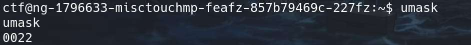 The umask value subtracts permissions from these defaults. Let's look at the umask 0022 what has been set in our challenge, it removes the write permission (2) for group and others: