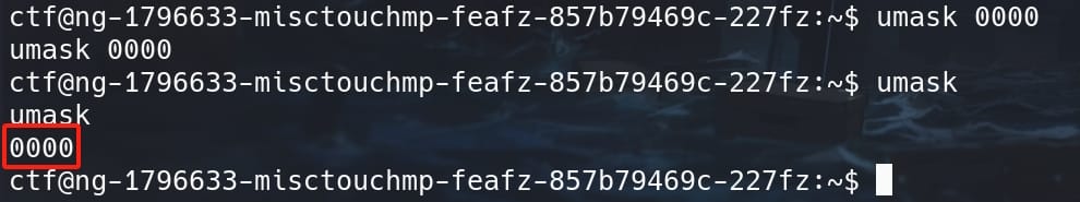 Now we are able to create new files of permissions same as the created user, that reflect the umask setting we just specified (minus 0000). Since touch is setuid root, it executes with root privileges, and the file it creates will have permissions based on the root's umask setting: